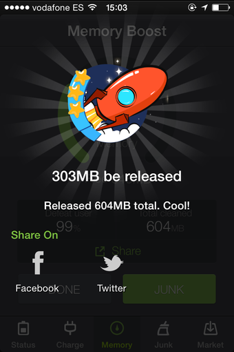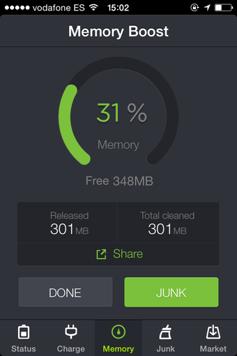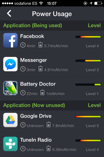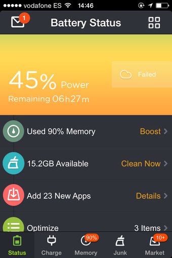 With Battery Doctor, you can get detailed information about the remaining percentage and subsequent time you have left before your battery dies, as well as how much time you can spend using each app before your battery drains. If you want to use YouTube, for example, you'll be able to use if for much less time than if you're planning to make a phone call. It'll also show you what to turn off to extend your battery, including Wifi, GPS, and screen brightness.One of the best features of the app is that it tell yous exactly how much battery power each app you have installed is using, separated into categories by the apps that are currently running, apps that aren't running, and system apps. By clicking on the four boxes in the top right of the screen and then on Discharge Rank, you can see a list of the apps that use up the most battery power. If you run Battery Doctor while you're charging your phone, you can get a history of you're phone's daily charges to see if your battery health is improving. You can even get a bit more advanced and check the CPU, hard disk, and memory usage on your phone, although the accuracy of memory usage isn't always reliable. Battery Doctor is super easy to navigate. All the options are really clear, and playing around with it for just a few minutes will tell you almost everything you need to know about using the app. The interface is really clean, and its pretty easy to find what you're looking for.There are different menu options at the bottom of the screen including Status, Charge, Memory, Junk and Market, which is just a separate marketplace for apps that's links to the App Store. Under Charge, you'll see how much time you need to fully charge your phone, as well as a health score for your battery. Junk helps you clean the cache for apps that you may not be using.